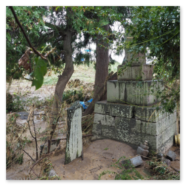 The Chikumagawa River and grave of Yamamoto Kansuke. The flood plain along the Chikumagawa River had been devastated by the floods. From debris left in the trees, the area where Yamamoto Kansuke's grave stood had been flooded to above head height.